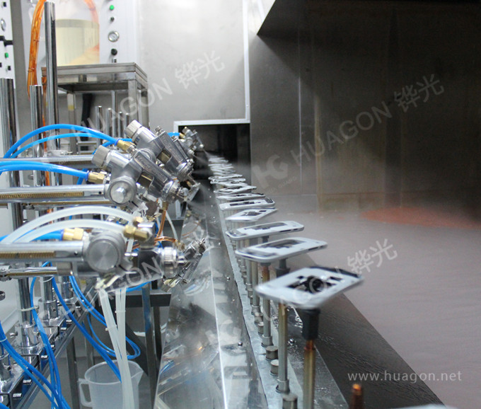 上料-手動靜電除塵-素材預熱-自動靜電除塵-自動底漆噴涂-表干-自動面漆噴涂-靜置-烘烤-冷卻-下料